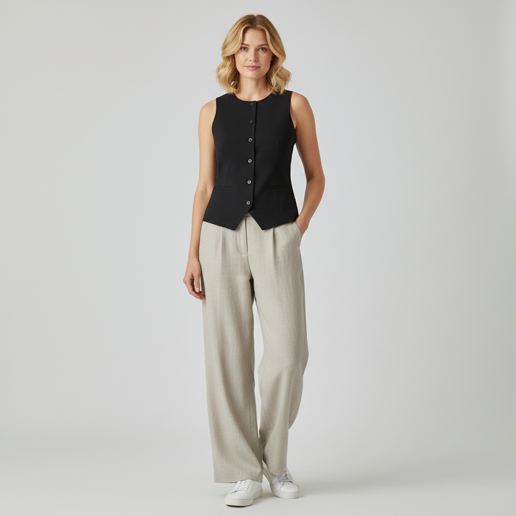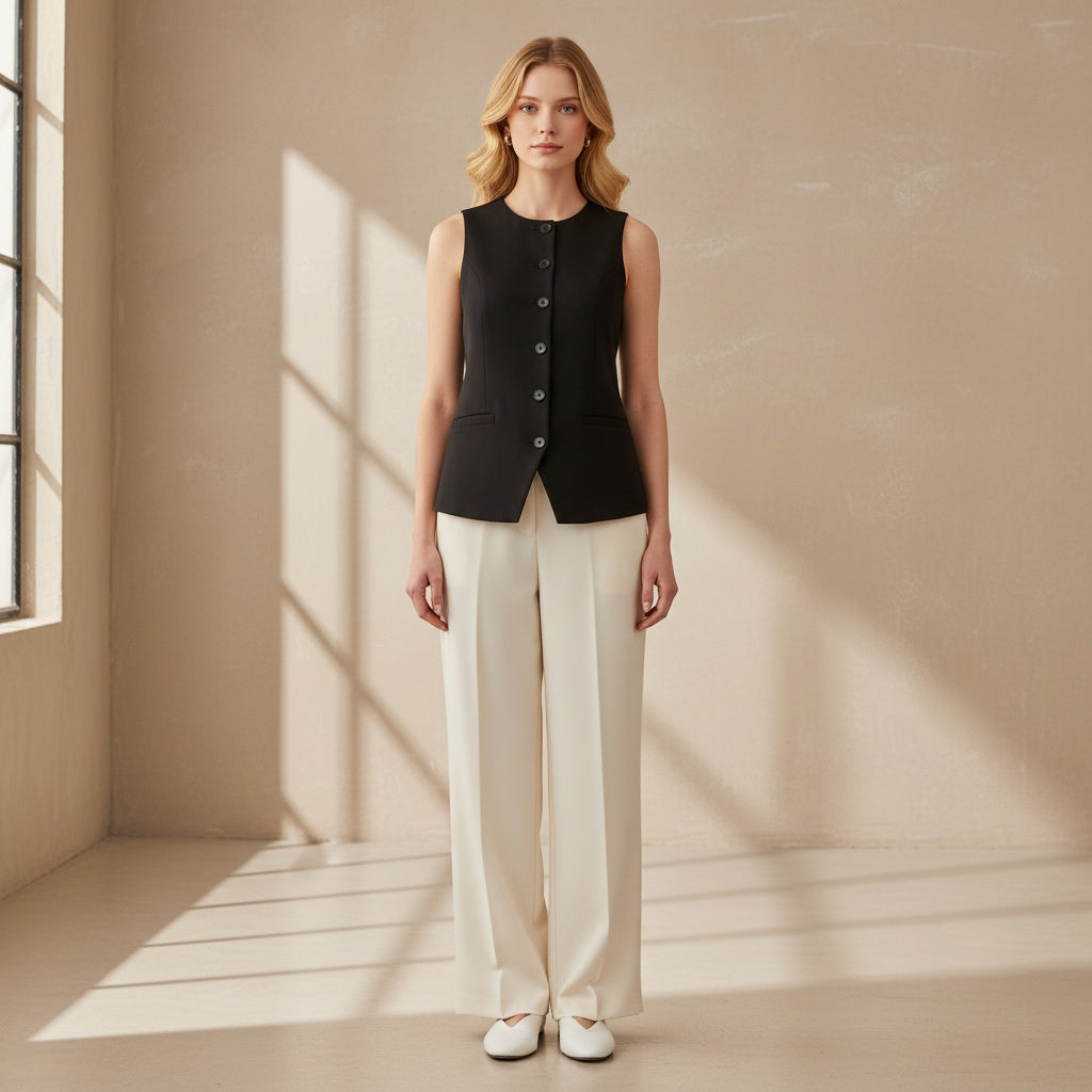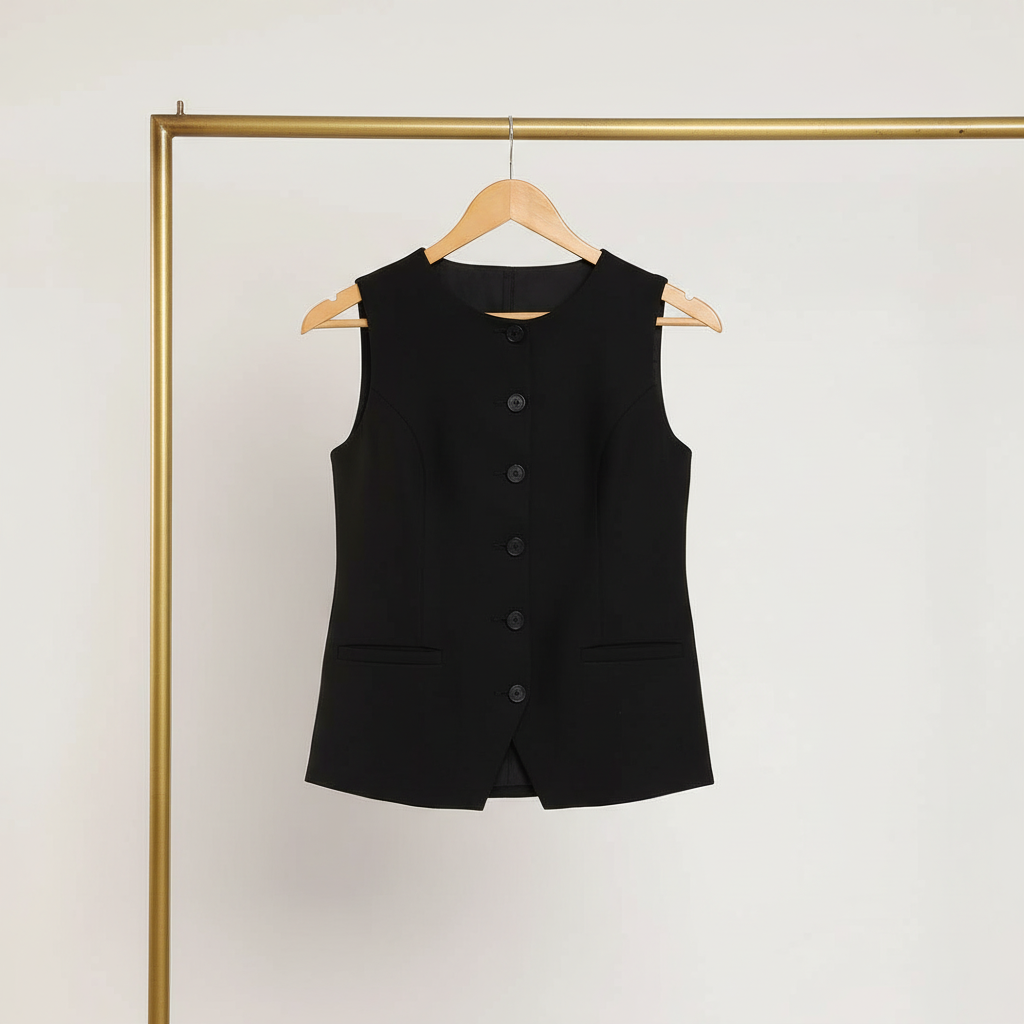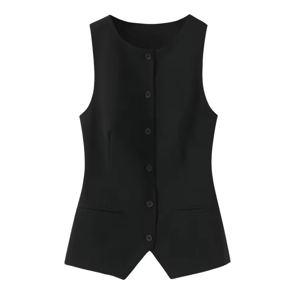 Elevate your wardrobe with this sleek and versatile black button-up vest. Crafted from a smooth, structured fabric, it offers a flattering fit that transitions seamlessly from office to evening. The minimalist design with front buttons and subtle welt pockets adds a touch of sophistication, making it an ideal layering piece over shirts or blouses. Perfect for creating a polished look with trousers, skirts, or wide-leg pants, this vest is a timeless essential for every modern wardrobe.