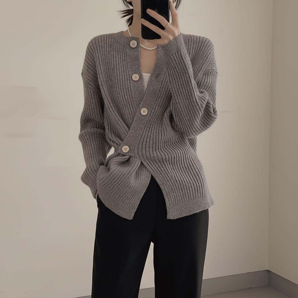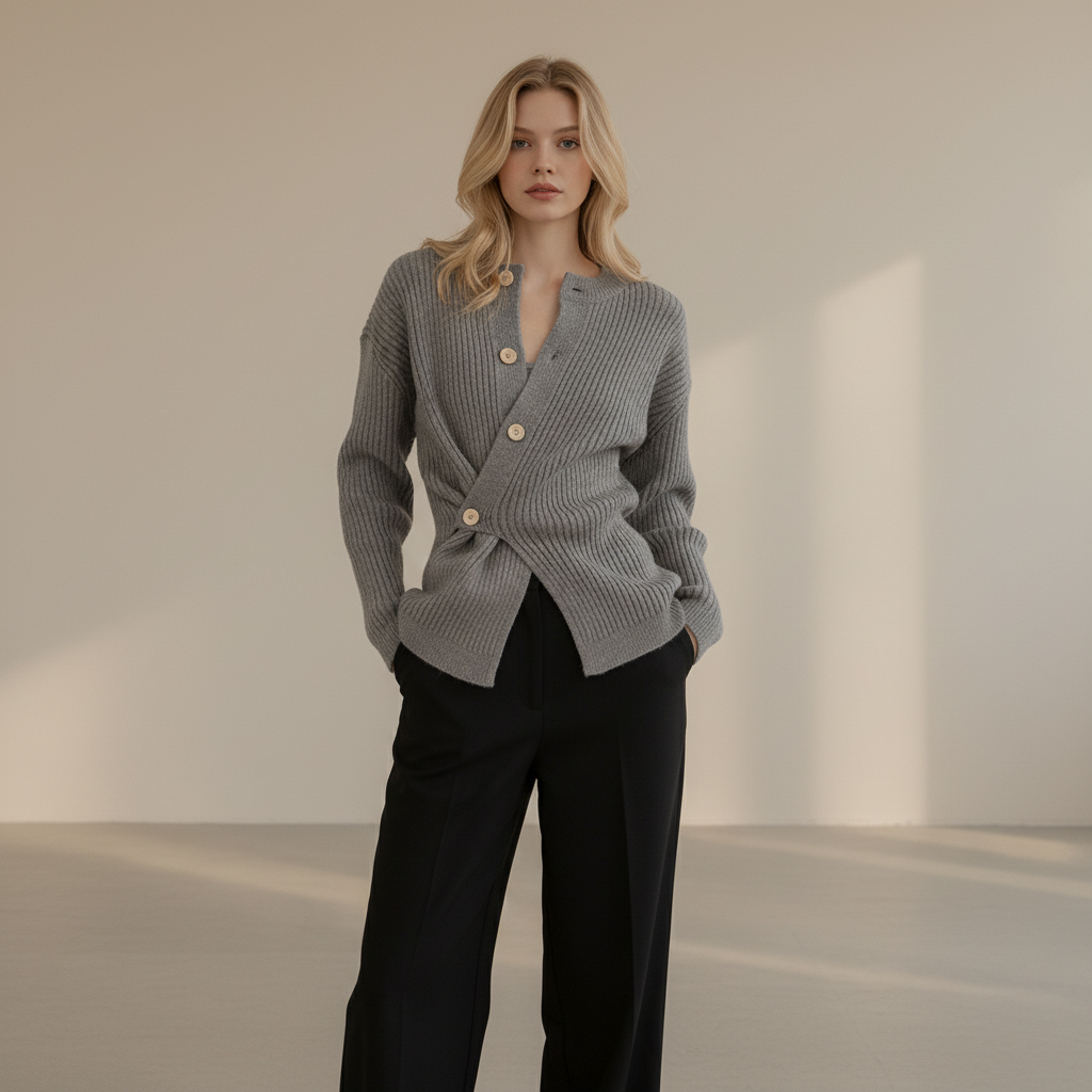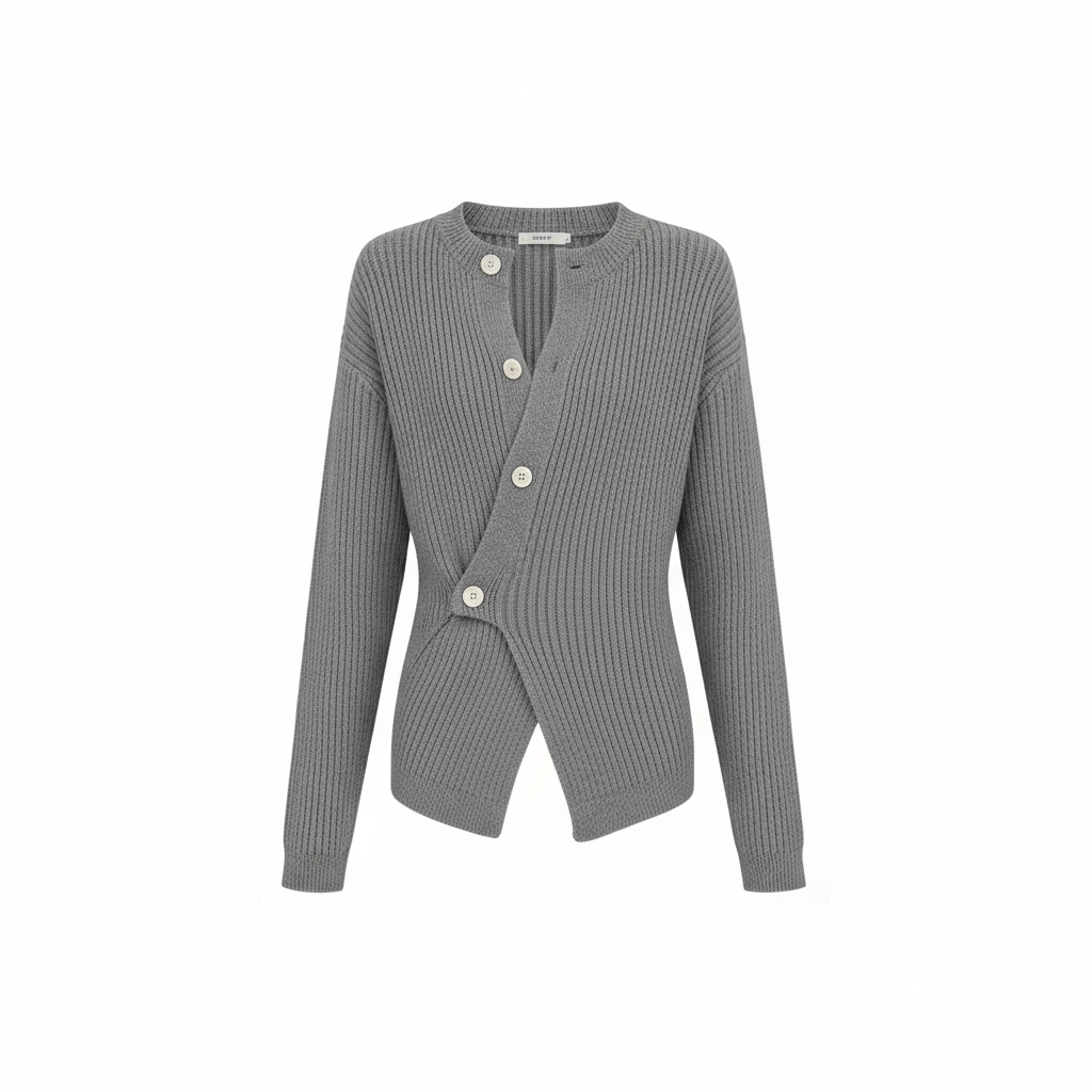 Add a touch of elegance and comfort to your wardrobe with this chic gray knitted cardigan. Crafted from a soft, breathable fabric, it provides warmth without compromising on style. The ribbed texture offers a snug fit, while the button closure and asymmetric design make it a trendy yet functional piece. Perfect for layering over casual or more polished looks, this cardigan is versatile enough for any occasion.
