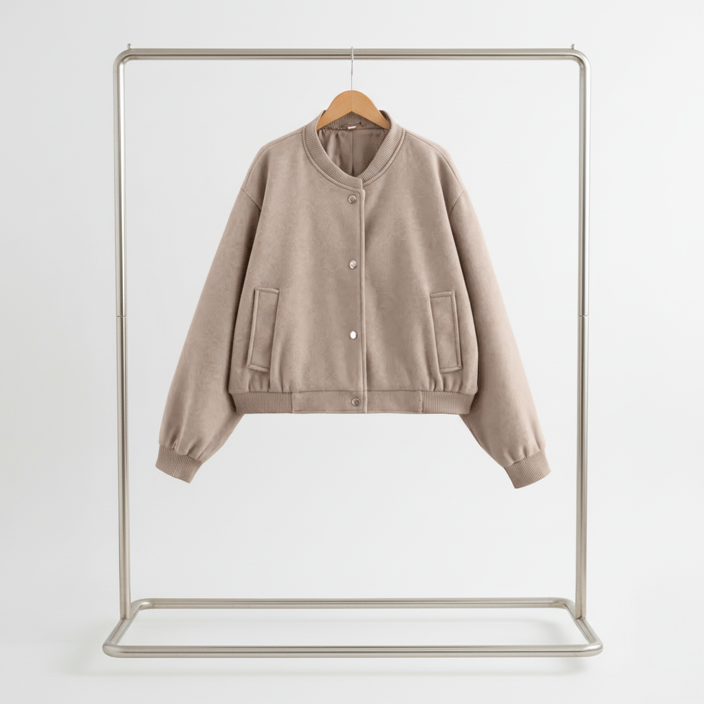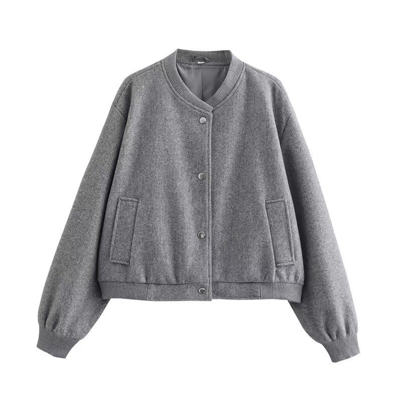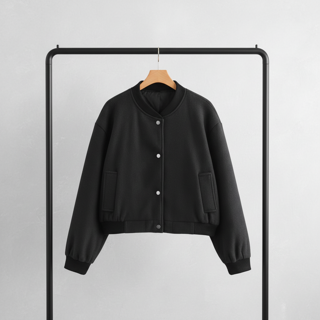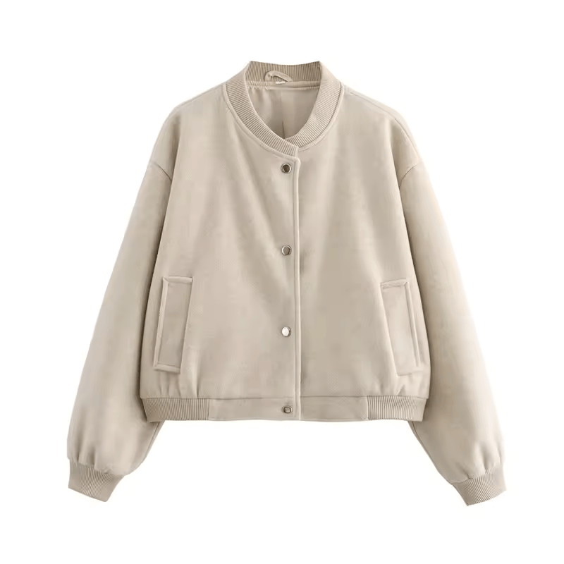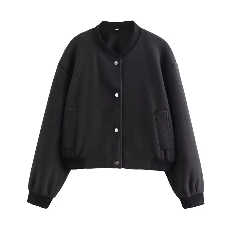 Stay cozy and stylish with this sleek bomber jacket. Crafted from a smooth, durable fabric, it offers both comfort and a modern edge. The ribbed cuffs and hem ensure a snug fit, while the button closure and functional pockets add both practicality and style. Its versatile design makes it perfect for everyday wear, whether for casual outings or more polished looks.