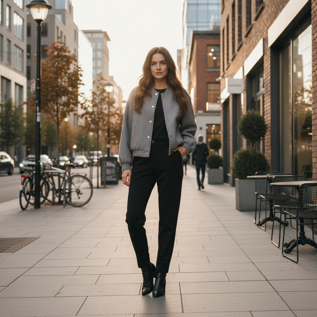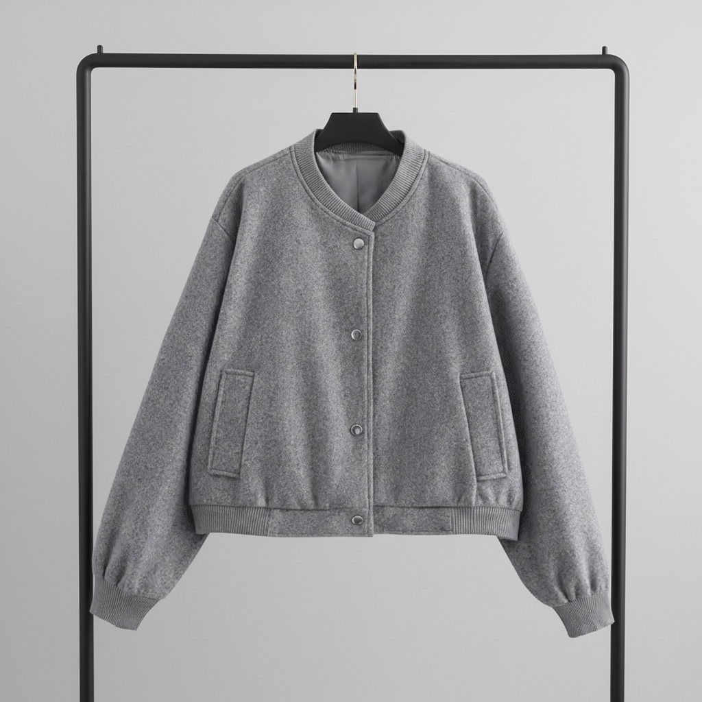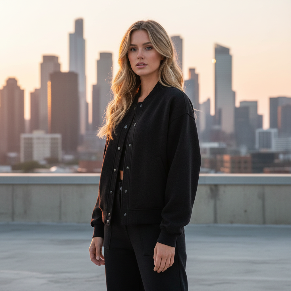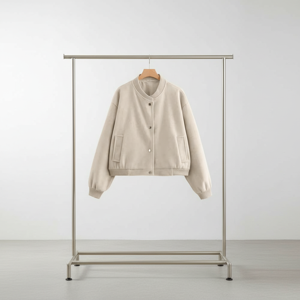 Stay cozy and stylish with this sleek bomber jacket. Crafted from a smooth, durable fabric, it offers both comfort and a modern edge. The ribbed cuffs and hem ensure a snug fit, while the button closure and functional pockets add both practicality and style. Its versatile design makes it perfect for everyday wear, whether for casual outings or more polished looks.