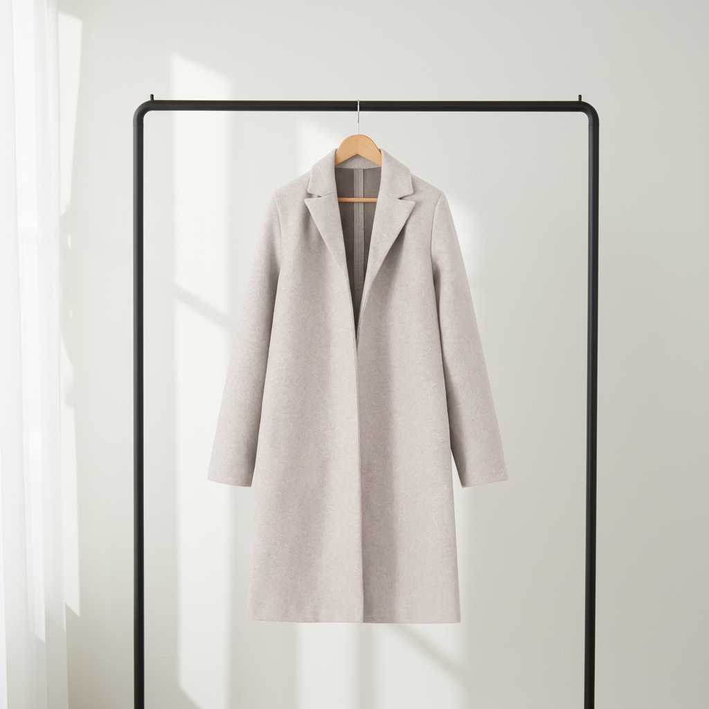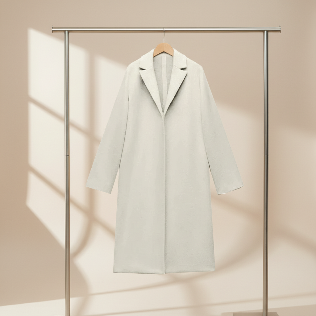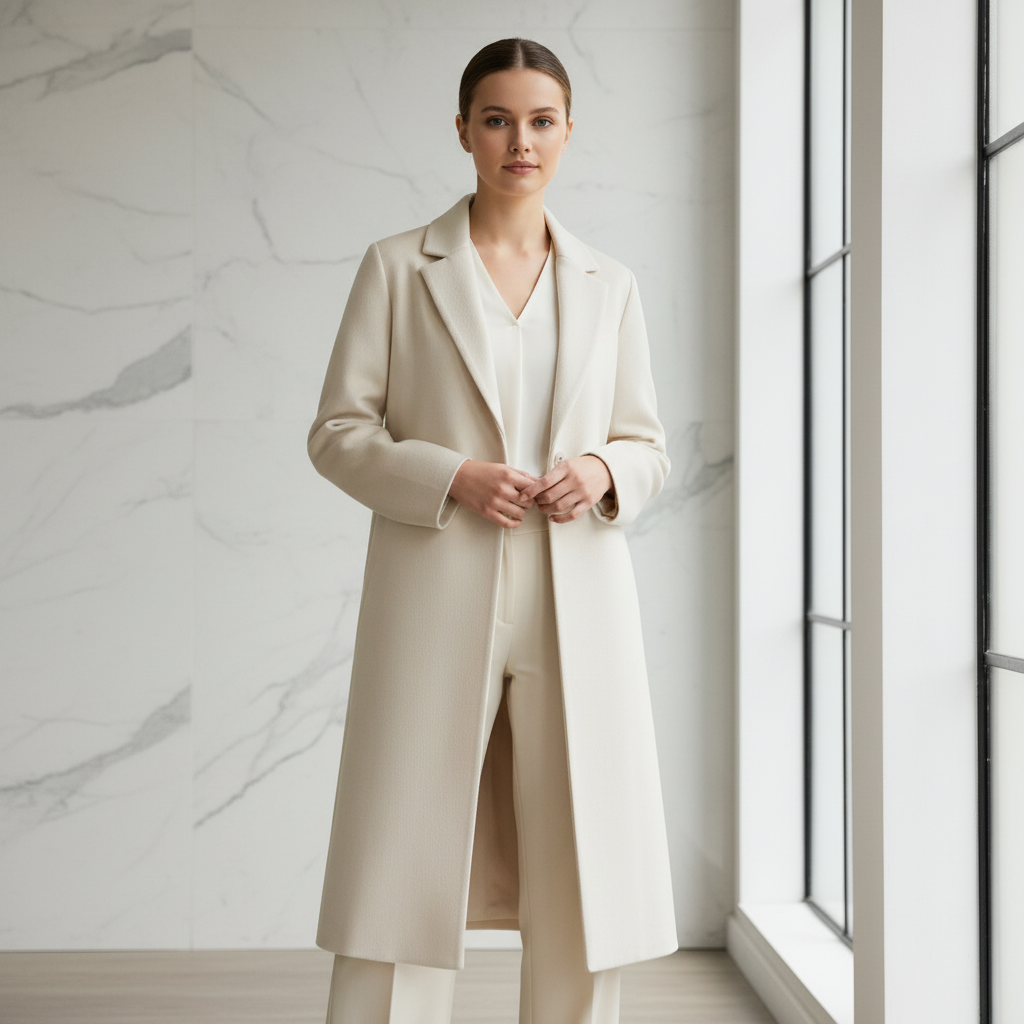 Step into timeless elegance with this minimalist cream coat. Featuring a clean, straight silhouette and sharp lapels, this piece is perfect for layering over any outfit. Its neutral shade and long length make it a versatile wardrobe staple for both casual and formal occasions.