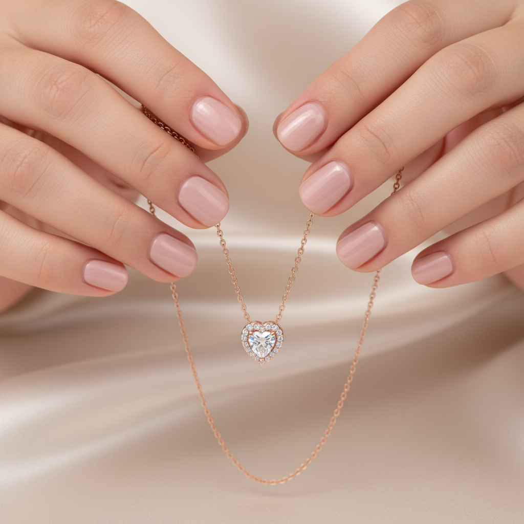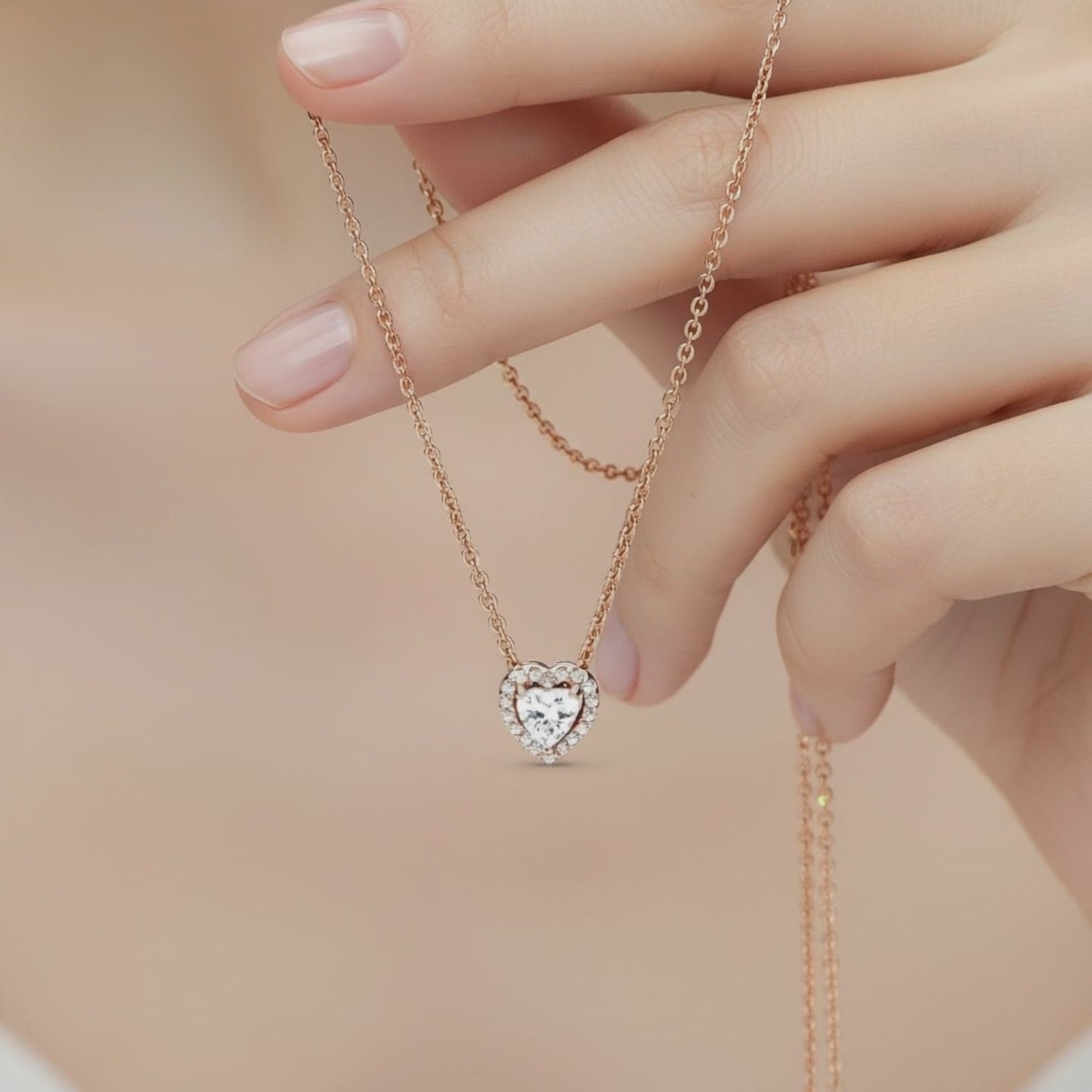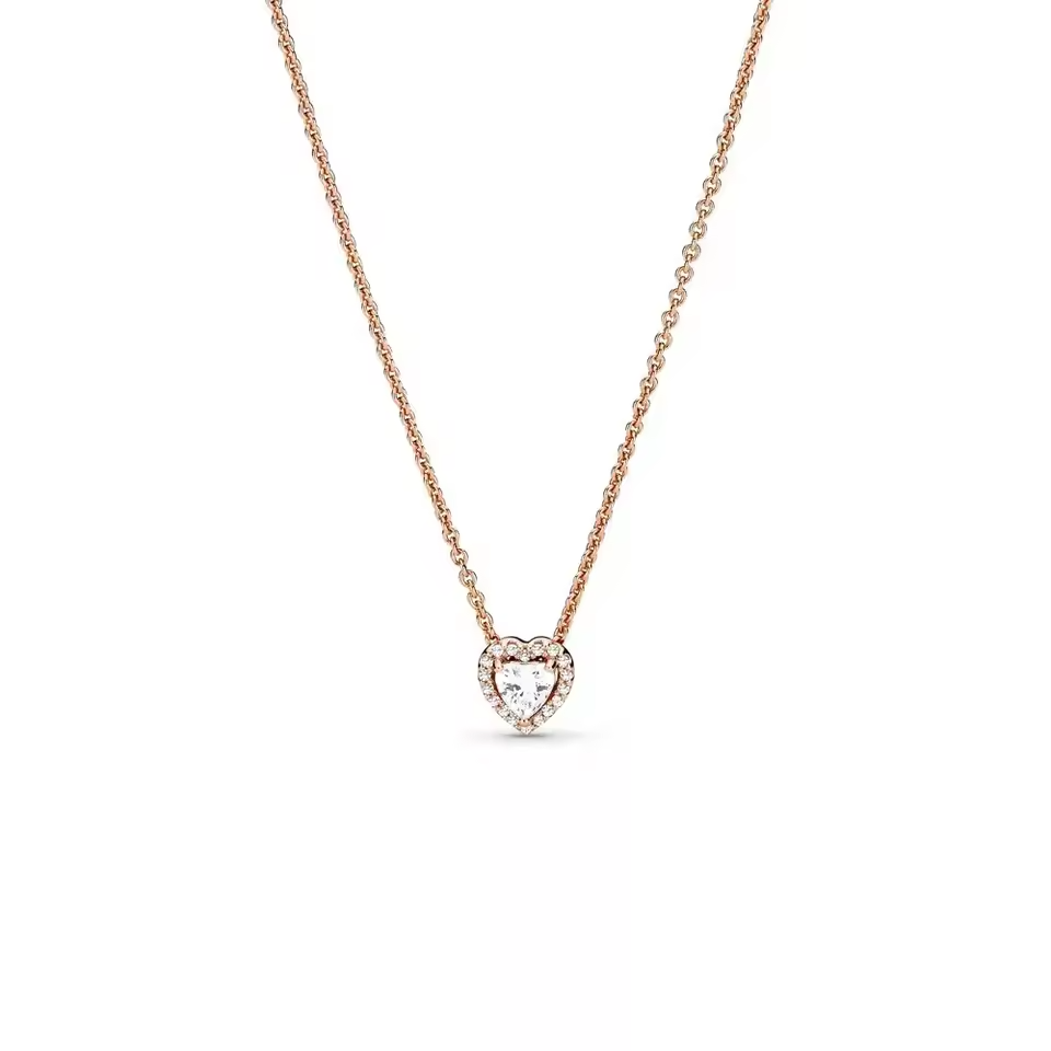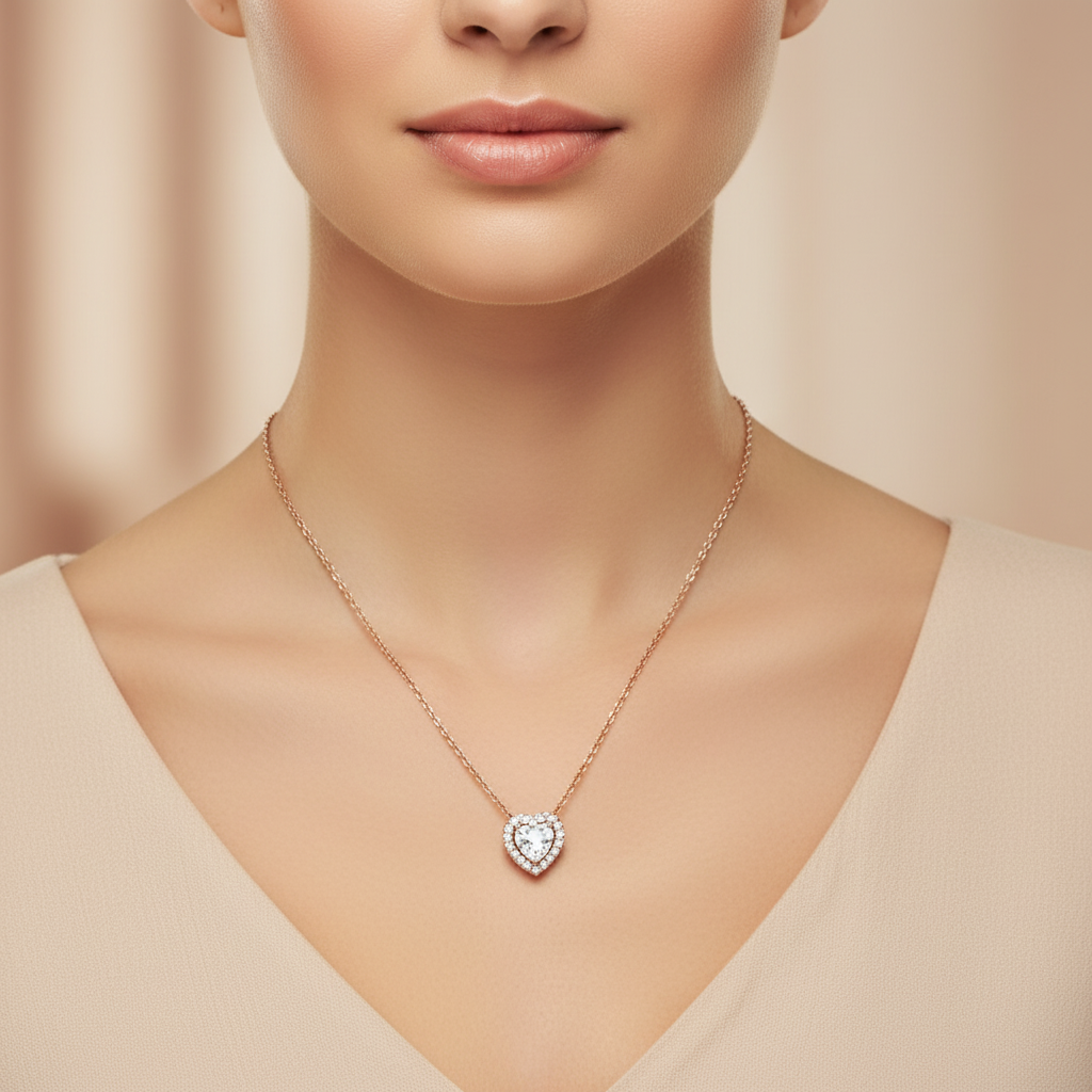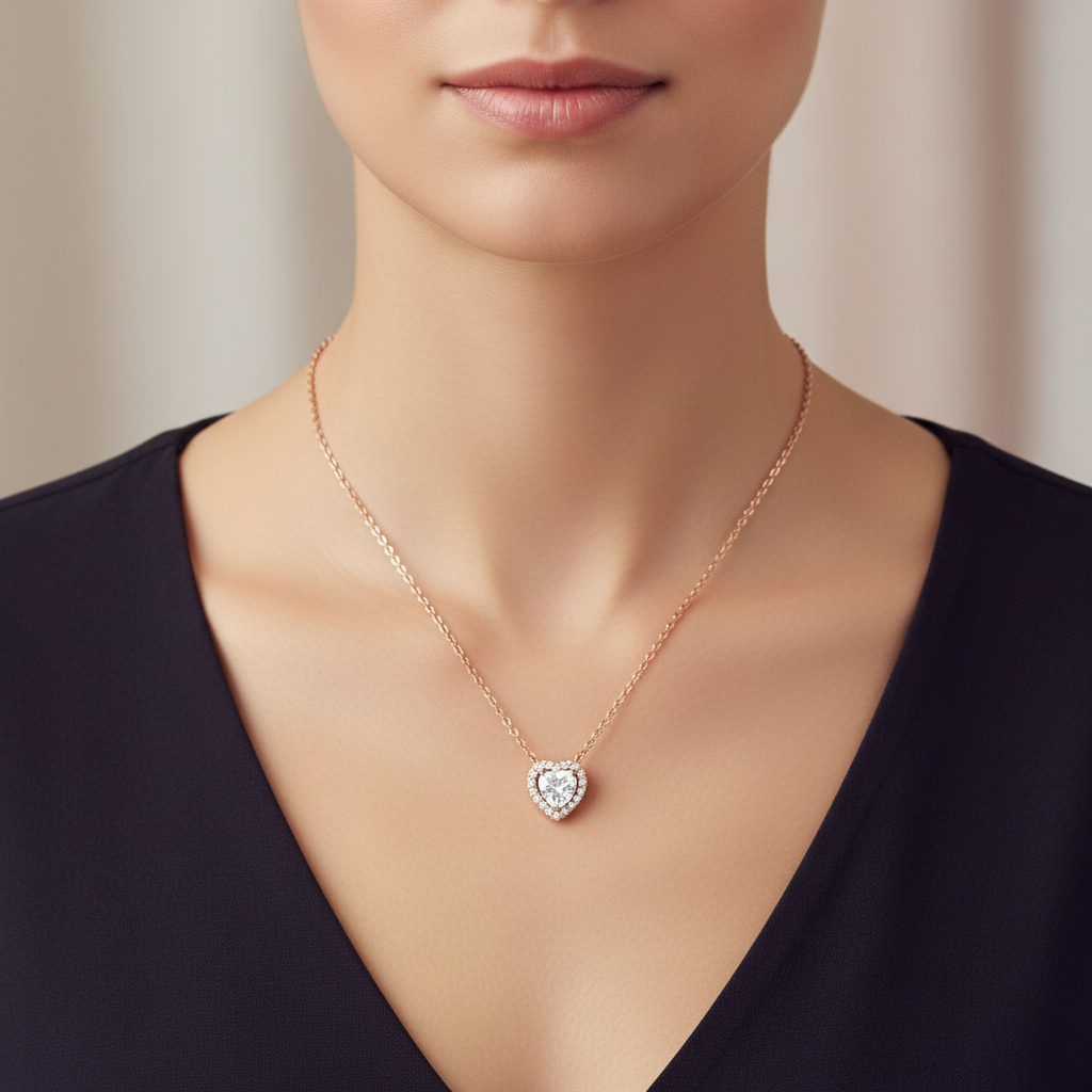 Celebrate timeless romance with this exquisite heart-shaped pendant necklace. Crafted in warm rose gold, it features a sparkling heart-cut centerpiece surrounded by a halo of brilliant stones that catch the light beautifully. The delicate chain adds a refined touch, making this necklace perfect for both everyday wear and special occasions. A meaningful gift or a stunning addition to your own jewelry collection.