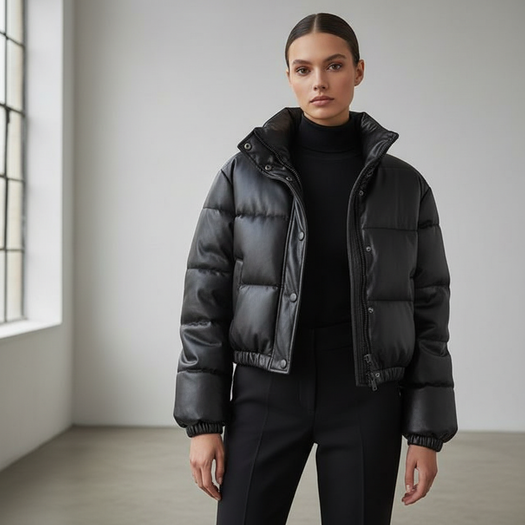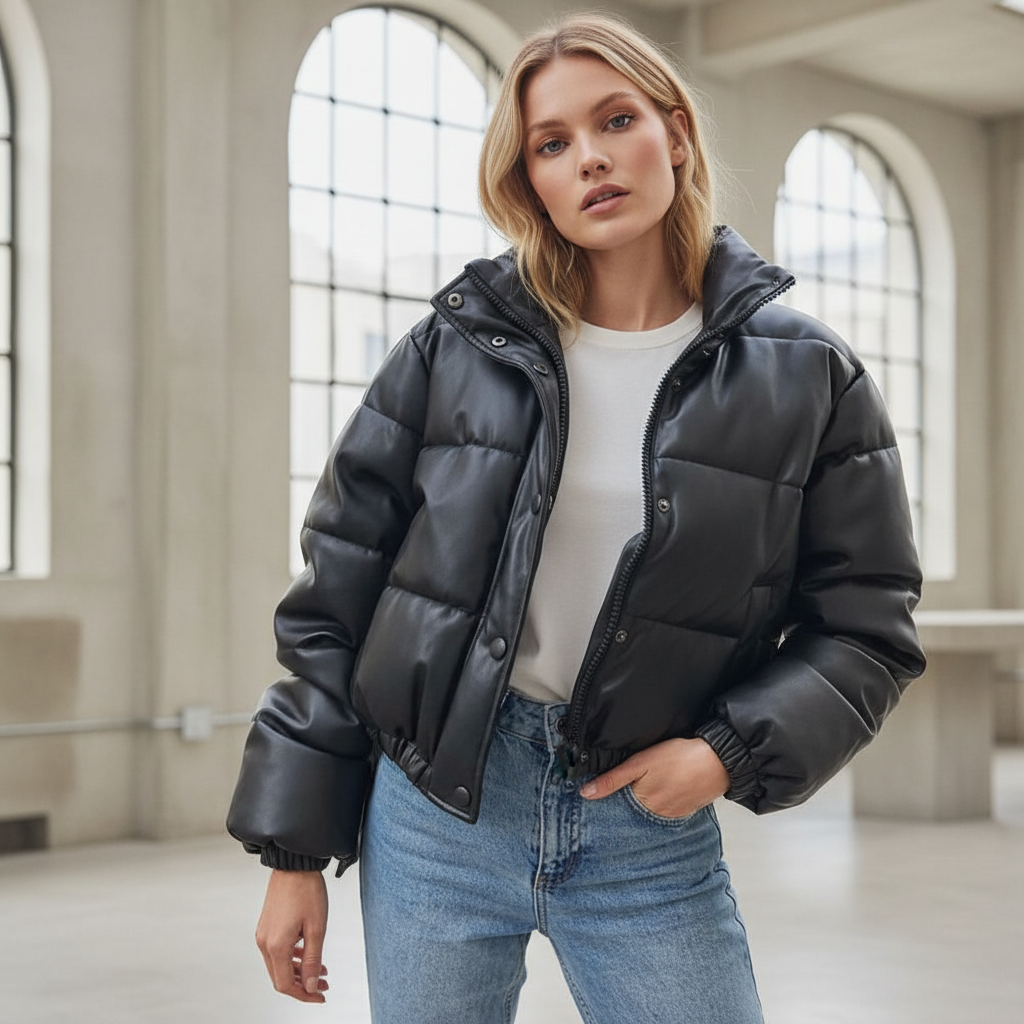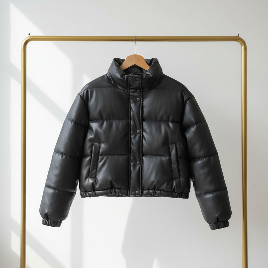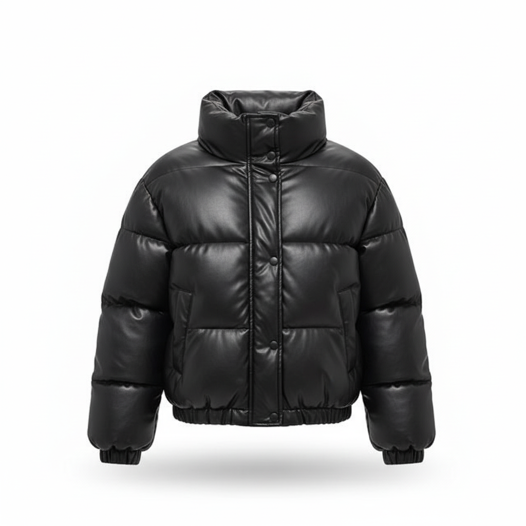 Stay warm and stylish with this sleek black puffer jacket. Crafted from a smooth, leather-look material, it combines cozy insulation with a bold, modern edge. The high collar and snap-button closure keep out the cold, while the slightly cropped fit adds a contemporary twist.